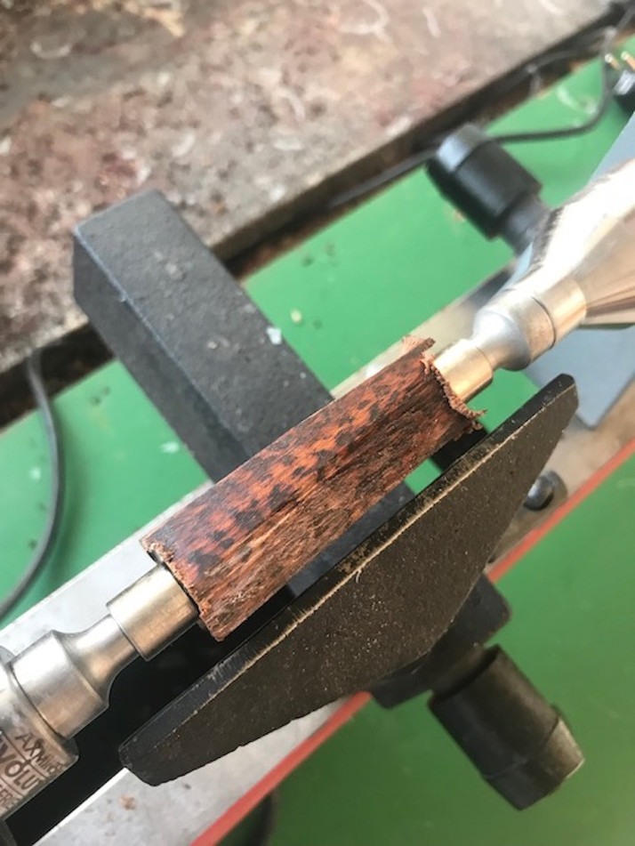 Na soustruhu to zdaleka nezačíná, ale je zde nejvíce vidět rozdíl mezi kouskem dřeva na začátku soustružení a hotovým dílem psací potřeby na jeho konci. Zde dřevo snakewood.