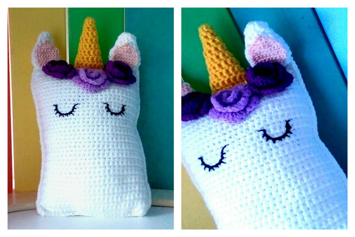 Háčkovaný jednorožec, poslouží jako malý dekorační polštářek