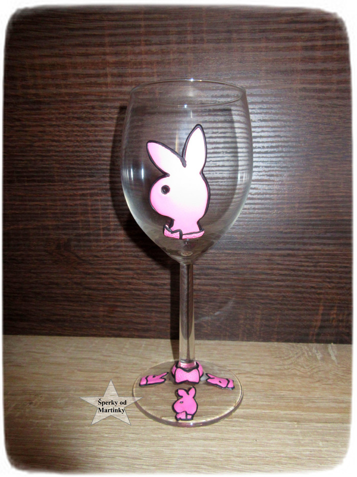 Sklenička na víno s Playboy-em. Prodáno,mohu vyrobi další. Cena 120 kč