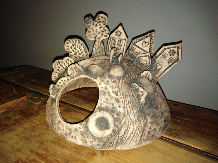 Vesnička na kopečku z pálené hlíny s patinou. Průměr cca 220mm v:150mm