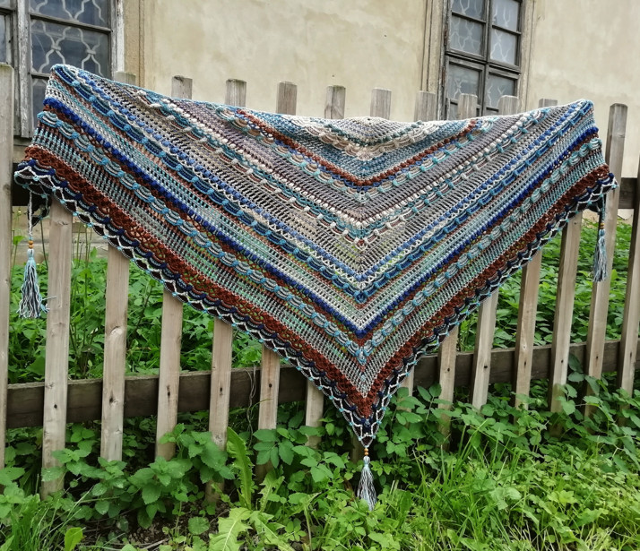 Bohémský šátek háčkovaný vzorem švédské designérky Johanny Lindahl....v mém provedení, barvy mořského příboje a skalnatých pobřeží.