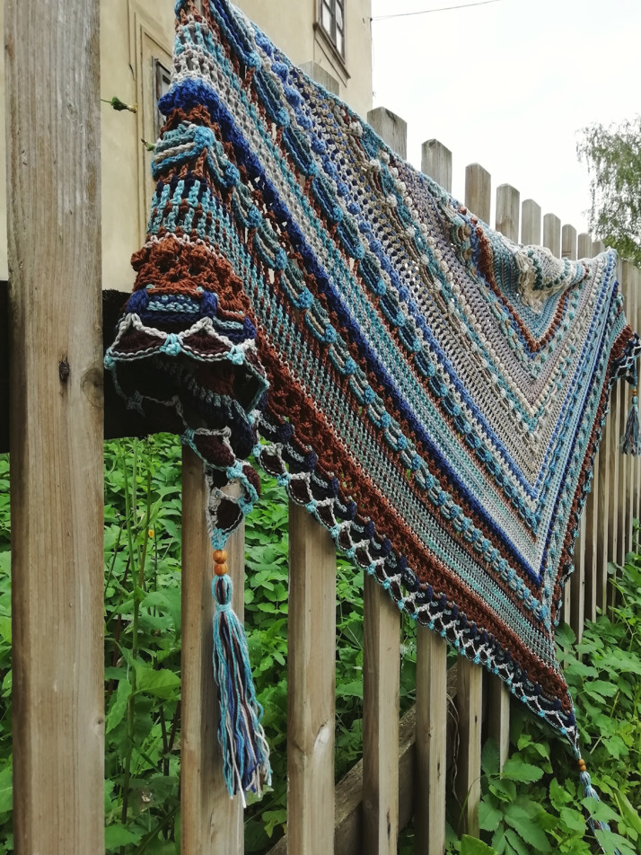 Bohémský šátek háčkovaný vzorem švédské designérky Johanny Lindahl....v mém provedení, barvy mořského příboje a skalnatých pobřeží.