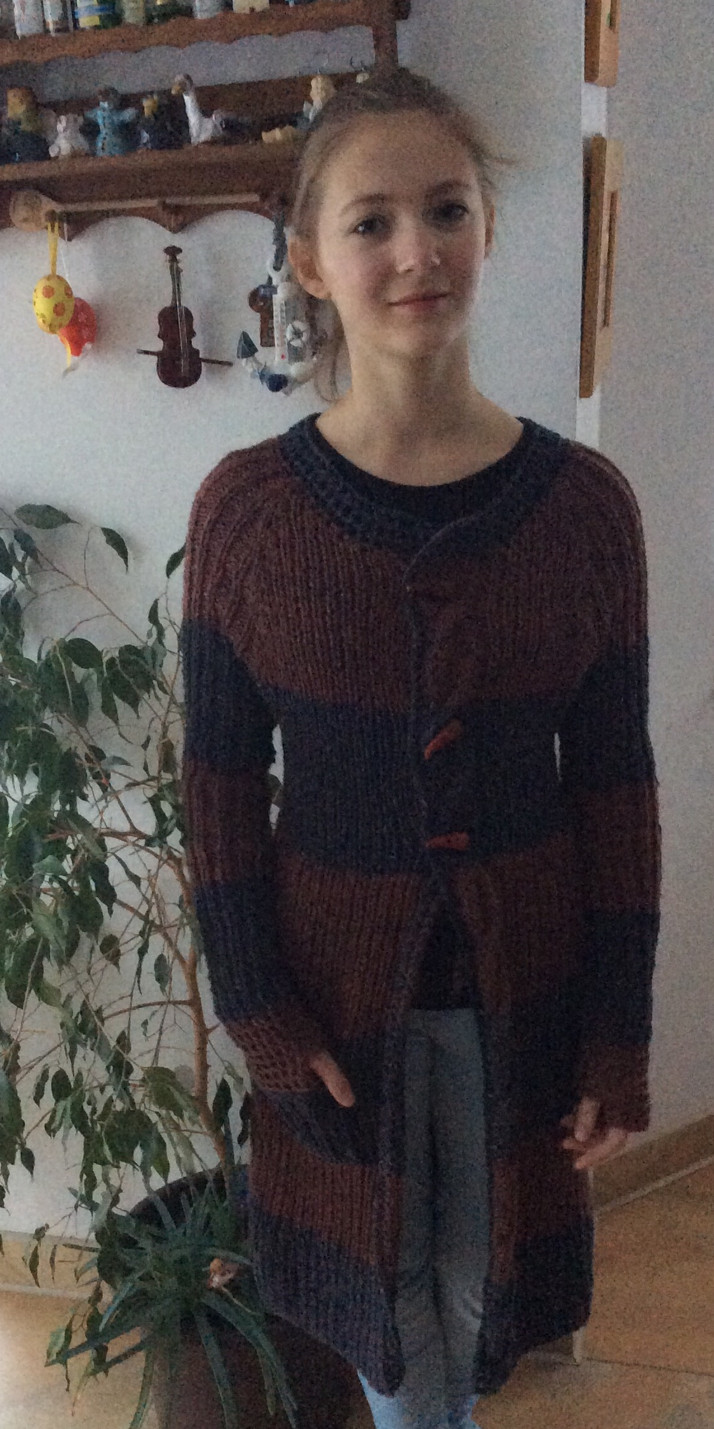 Pletený svetr tmavé pruhy s kapsou , prodloužené rukávy s návlekem