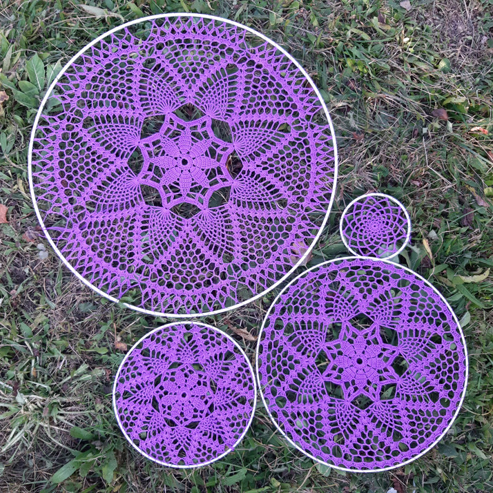 Sestava háčkovaných mandal k zavěšení, sestavit lze podle vlastní fantazie.