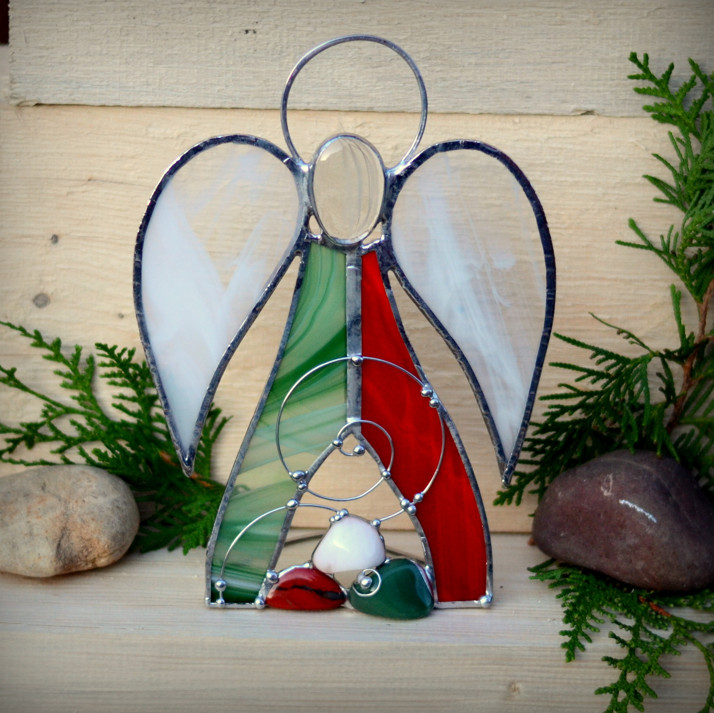 Zeleno-červený andělíček svícen s aventurinem, jaspisem a mléčným křemen