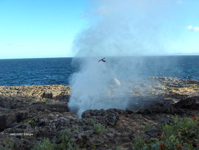 Tohle místo se nachází v El Francés, je to pár kilometrů před Las Galeras. Voda při příboji vniká do otvoru a vytváří malý gejzír.