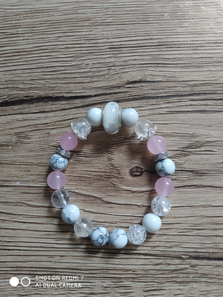 náramek dámský, složení minerálů: bílý howlit(magnezit), růženín a praskaný křišťál s doplňkem bílého prstence a stříbrných komponentů,šířka zápěstí 16cm
