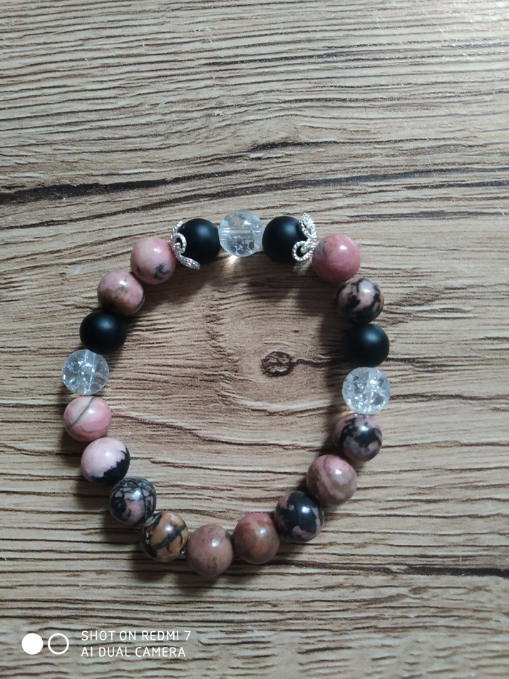 náramek dámský, složení minerálů: černý onyx, praskaný křišťál a rodonit, doplněný o stříbrné komponenty ve tvaru kytiček, šířka zápěstí 16cm, průměr kamenů je 8mm