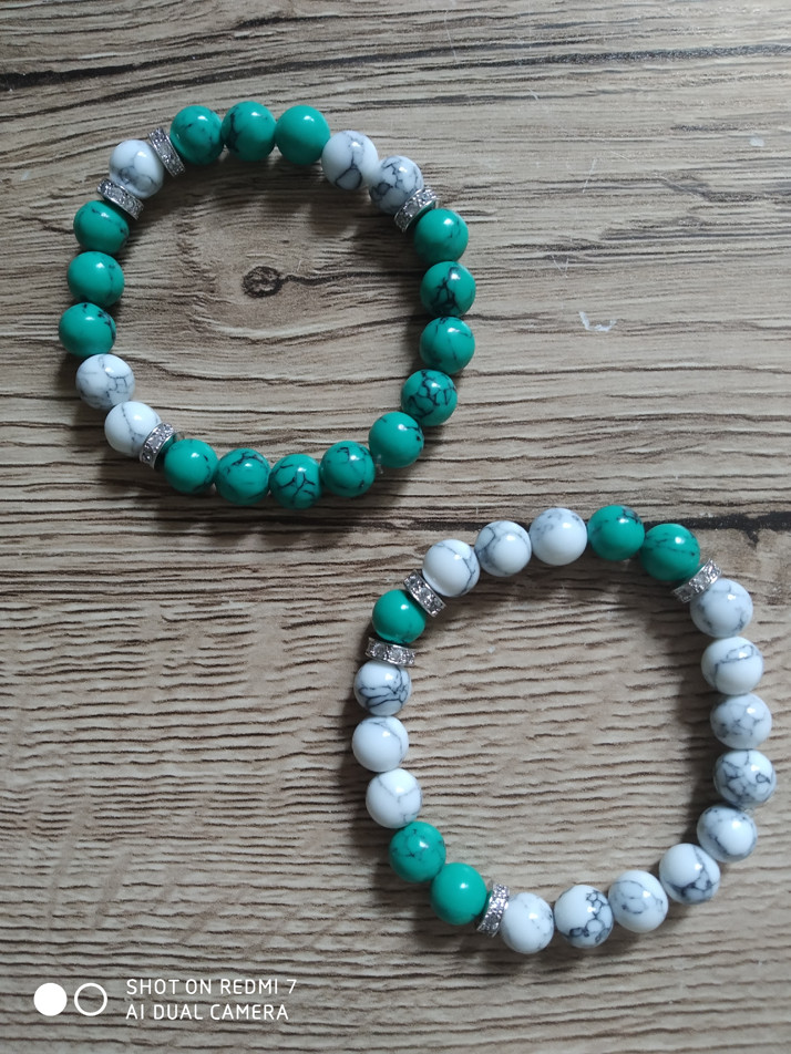 náramek dámský, kombinace dvou náramků, složení minerálů: bílý howlit (magnezit), zelený tyrkys, doplněný o stříbrné komponenty, šířka zápěstí 17cm, průměr kamenů 8mm