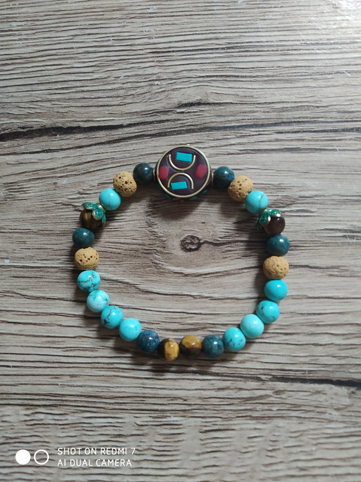 náramek dámský, složení minerálů: tygří oko, modrý ametyst, lávový kámen v hořčicové barvě, modrohnědý achát, doplněný o kulatý komponent s africkým motivem, šířka zápěstí 16cm, průměr kamenů 6mm