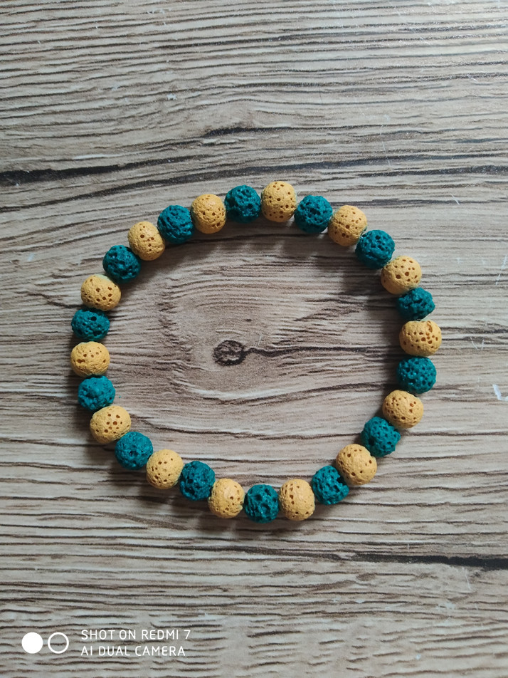 náramek dámský, složení minerálů: lávový kámen v hořčicové a tyrkysové barvě, šířka zápěstí 17-18cm, průměr kamenů 6mm