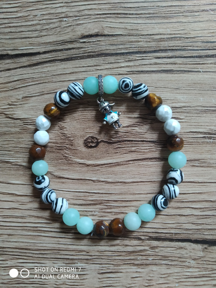 náramek dámský, dívčí, složení minerálů: bílý howlit (magnezit), tygří oko, černobílý malachit, matný "zmrzlý" amazonit modré barvy, doplněn o stříbrný komponent (925) chlapečka, šířka zápěstí 16cm, průměr kamenů 6mm