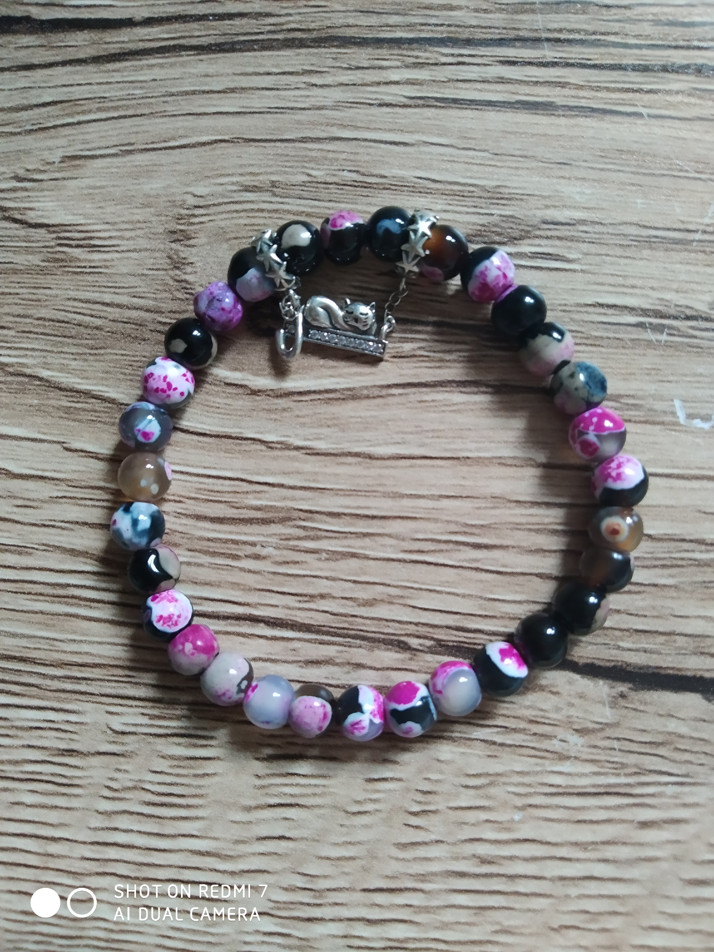 náramek dámský, složení minerálů: red rose achát, doplněn o stříbrný komponent (925) kočičky, šířka zápěstí 16-17cm, průměr kamenů 6mm