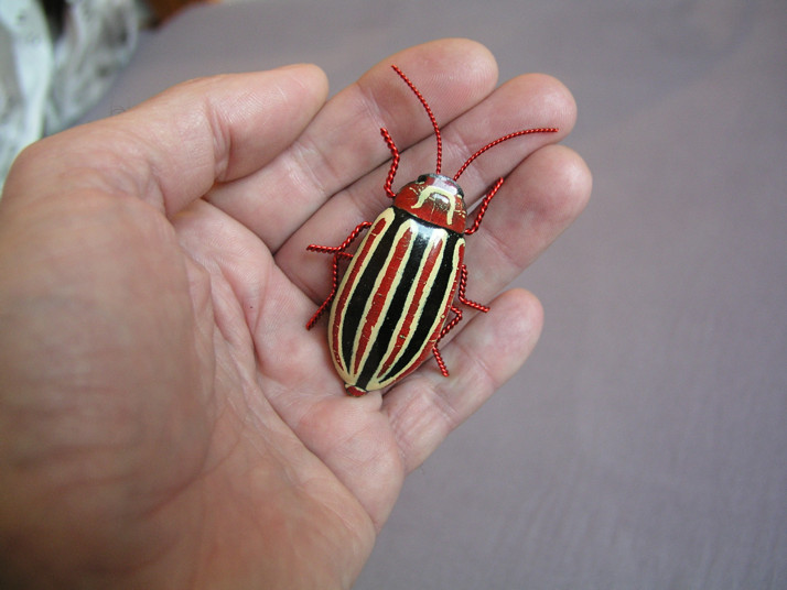 Zajímavý brouk rodu Disonycha vyrobený na zakázku pro entomologa do kazety s dalšími sedmi chrobáky, všichni podle skutečný vzorů z přírody.
