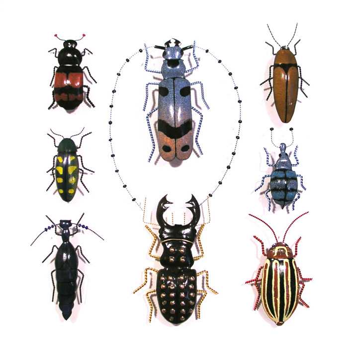 Brouci vyrobení pro entomologa podle skutečných vzorů, ale ve větším měřítku, v kazetě 25x25cm.