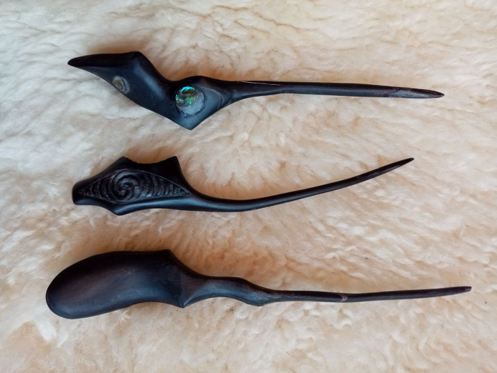 jehlice z černého kravského rohu zdobené řezbou nebo perletí