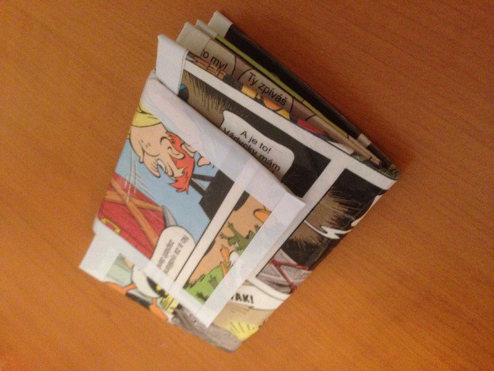 Komiksová peněženka vyrobená z krabice od mléka a starých komiksů Kačera Donalda. Cena 300 Kč.