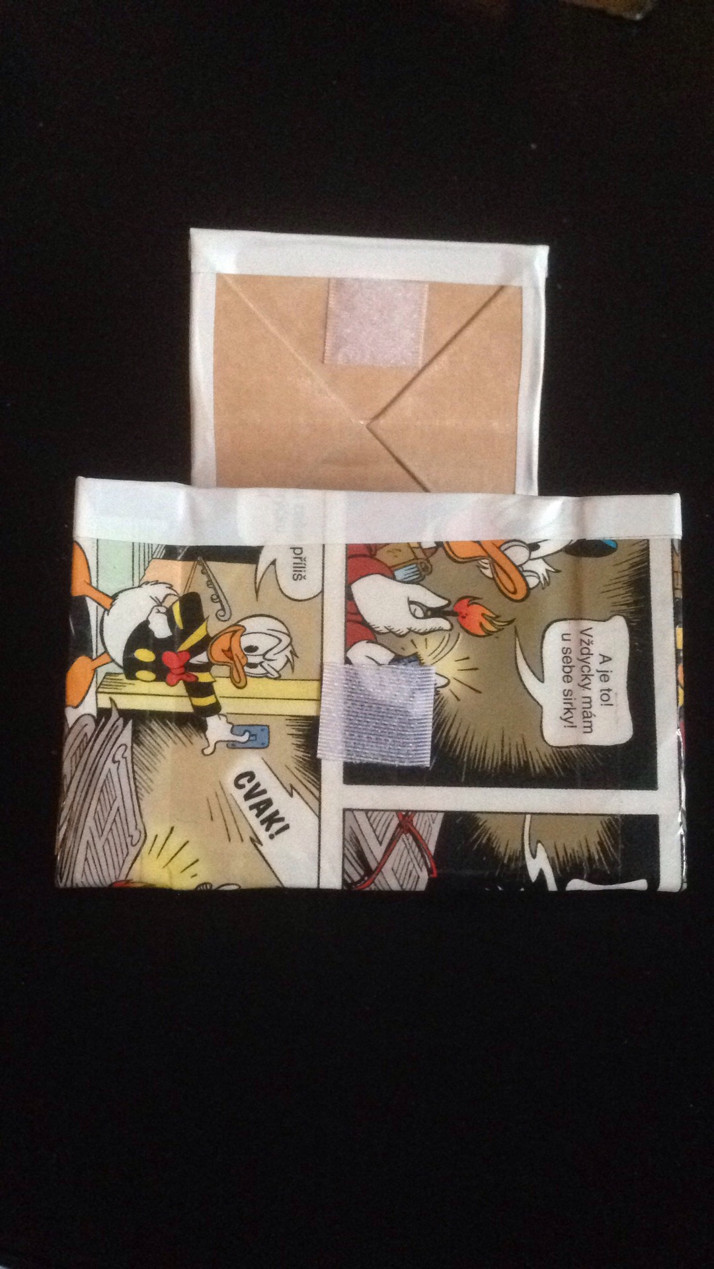 Komiksová peněženka vyrobená z krabice od mléka a starých komiksů Kačera Donalda. Cena 300 Kč.