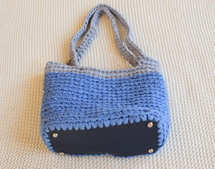 Modrá háčkovaná kabelka z bavlněného špagátu.