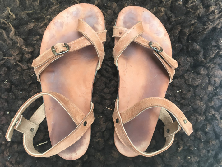 Kamarádka s malým dítětem potřebovala sandálky s rychlooubouváním, tak vznikly tyhle. Vyfocené jsou po roce používání, kdy kůže získala osobní patinu.
