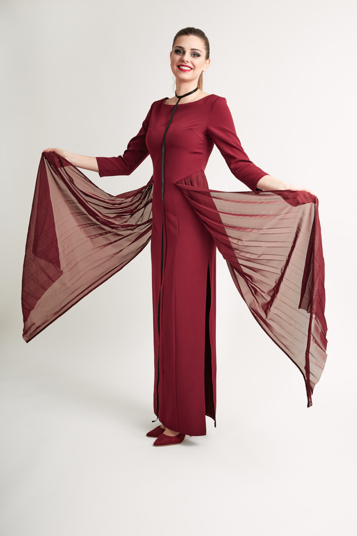 Bordové spoločenské šaty s plisovaním, ktoré ukrýva vysoké rázporky a čiernym odopínateľným chokerom