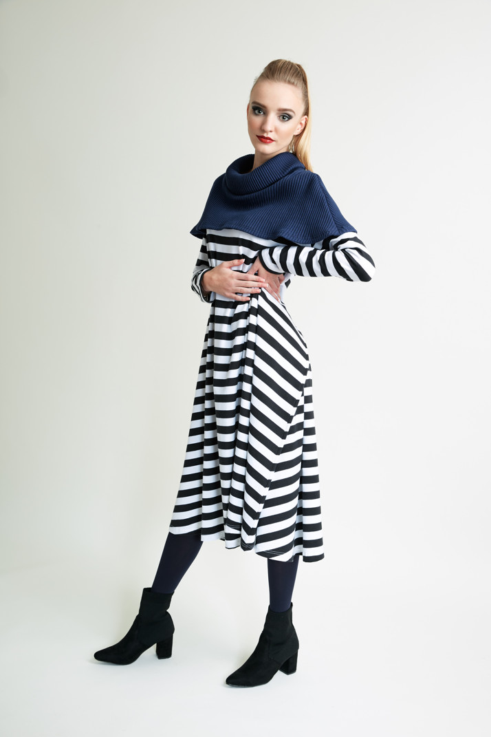 Čierno-biele pruhované úpletové šaty s variabilným zapínaním cípov