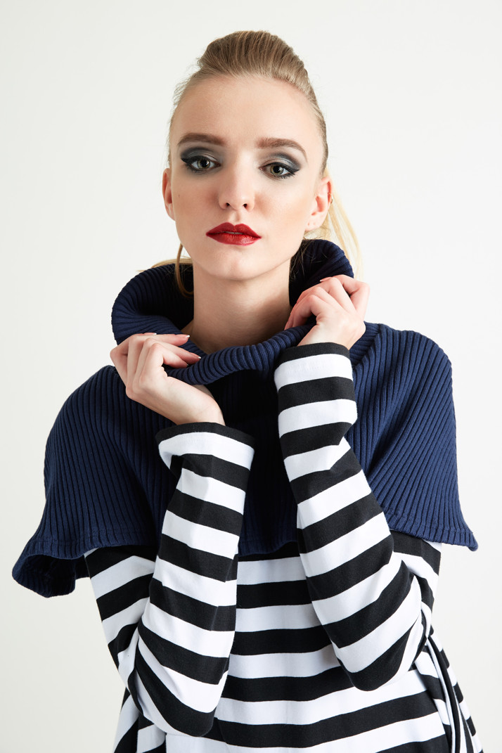 Modrý úpletový nákrčník, možnosť kombinácie s pruhovanými úpletovými šatami
