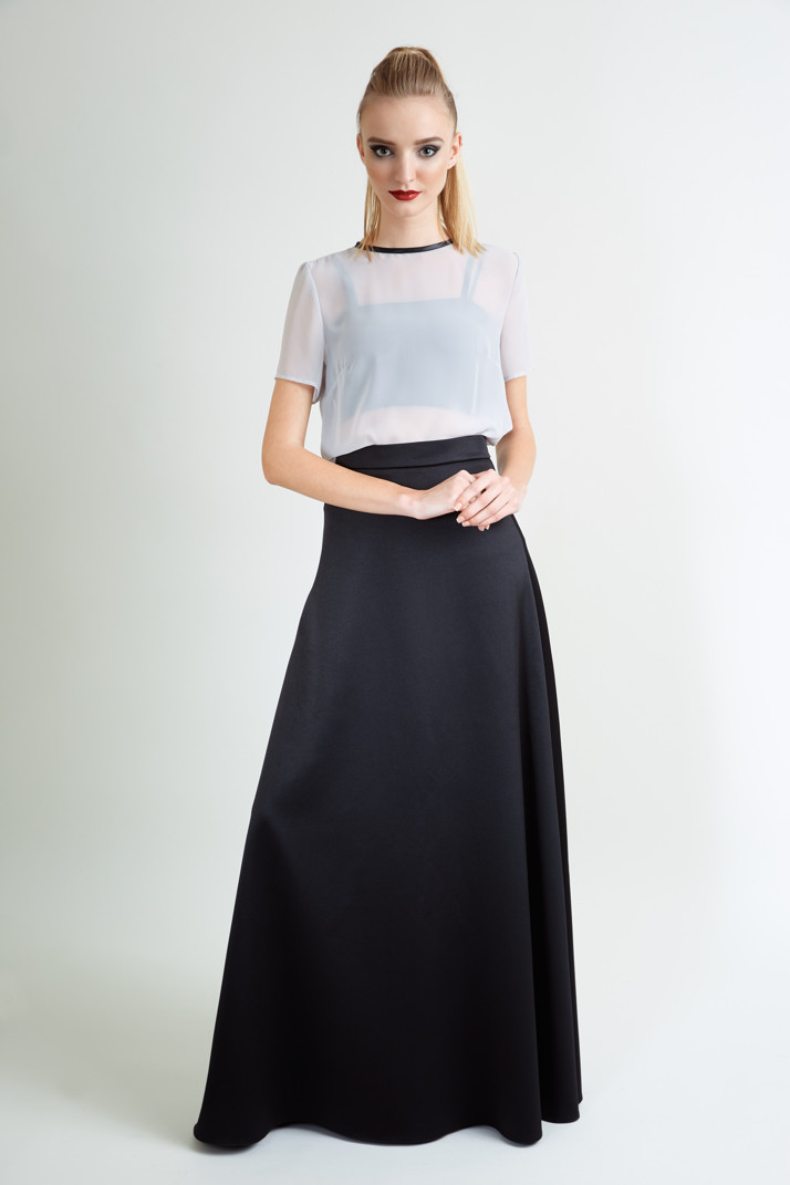 Čierna spoločenská sukňa áčkového strihu zvýrazňujúca pás