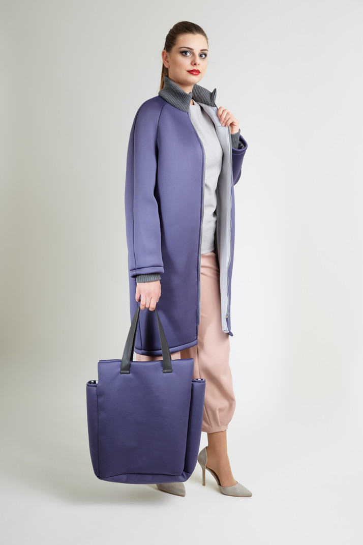 Modrá úpletová bundička podšitá šedou podšívkou, so šedým rolákovým ukončením okolo krku, dĺžka po kolená