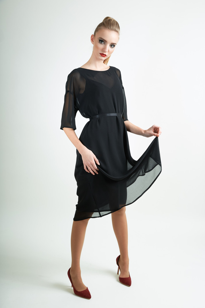 Dvojšaty - šaty pozostávajúce zo spodných a vrchných šiat. Čierne spodné šaty na ramienka doplnené čiernymi vrchnými šatami s obráteným golierom, ktorý využíva hru materiálu s transparentnosťou. Model je doplnený opaskom, ktorý zvýrazňuje pás.