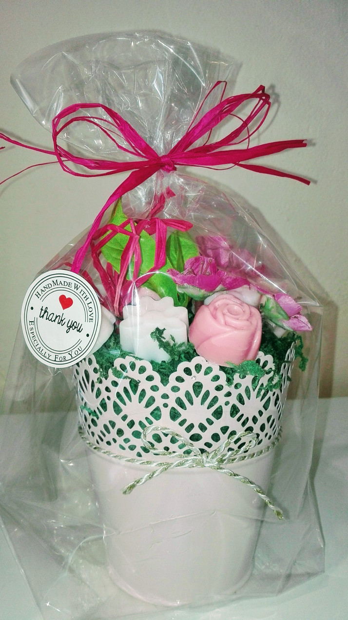 Takto vám odesílám mýdlové - květinové květináčky. Dárkové balení v celofánu s mašličkou a samolepkou Hand made.
