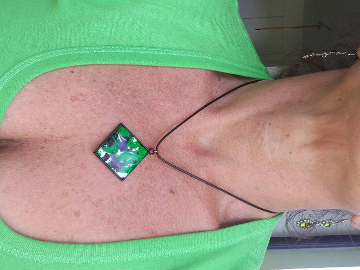 Čtvercový přívěsek z hmoty fimo 3x3 cm v nespoutané barevné kombinaci zeleno-fialové doplněné o černé a bílé tóny. Zasazený do kovového rámečku a zavěšený na černé kožené šňůrce s nastavitelnou délkou, uzávěr kovový.