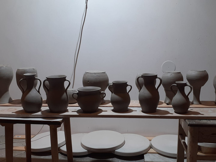 Zatím mám doma kruh, ale transport vypalovací pece se teprve připravuje. Pro teď tedy alespoň ukázka polotovarů. Výrobky, které vzešly z kruhu, jsou už po obtočení (finální úprava) a jsou už na nich ouška. Teď je čeká pár dní sušení a pak dekorování a výpaly.