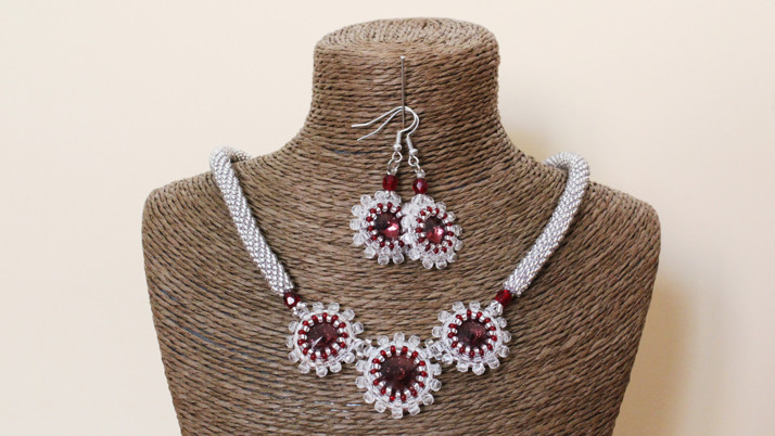 Sada náhrdelníku a náušnic s obšívanými rivolkami a háčkovanou dutinkou na přání pro budoucí nevěstu.