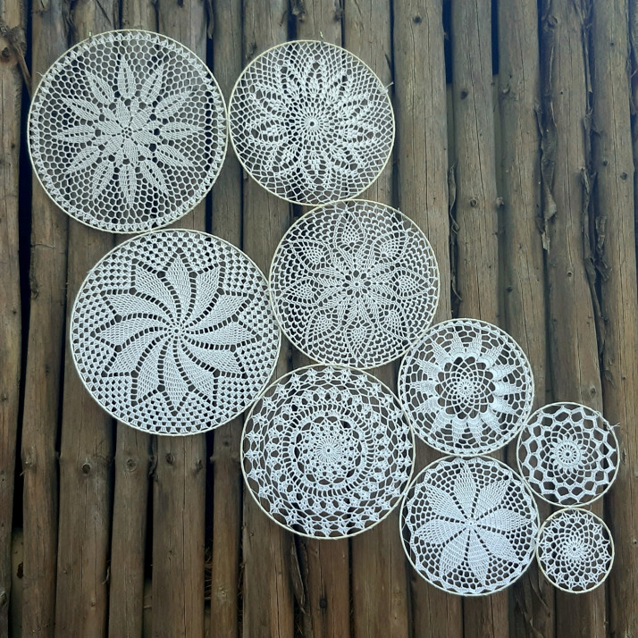 Sestava háčkovaných krajek na přání, barva, počet i velikosti jednotlivých kruhů lze změnit.