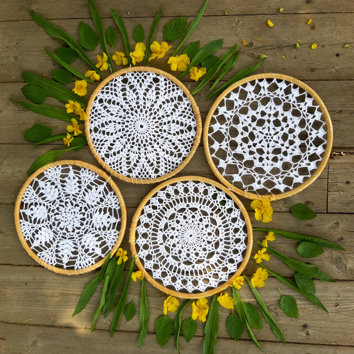 Háčkované krajky v bambusových kruzích, jako základ na výrobu vlastního lapače snů, do okna či na zeď, svatební dekorace, dárek...