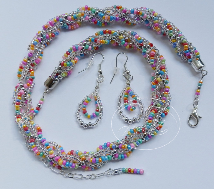 Spirála šitá z drobného duhově barevného a stříbrného rokajlu