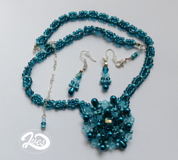 ozeta šitá z několika odstínů tyrkysových čirých a matných rokajlů, rondelů a perleťových kapek s broušenou ohňovkou uprostřed přišitá na proplétaném závěsu