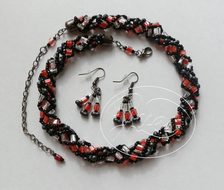 Spirála šitá z drobného černého rokajlu, čirých červených kostiček, stříbrných sekaných trubiček a šedých farfalů