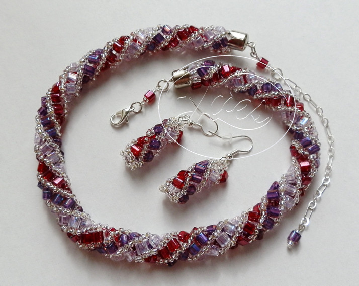 Spirála šitá z drobného stříbrného rokajlu a čirých kostiček fuchsiových, lila a fialových metalických odstínů
