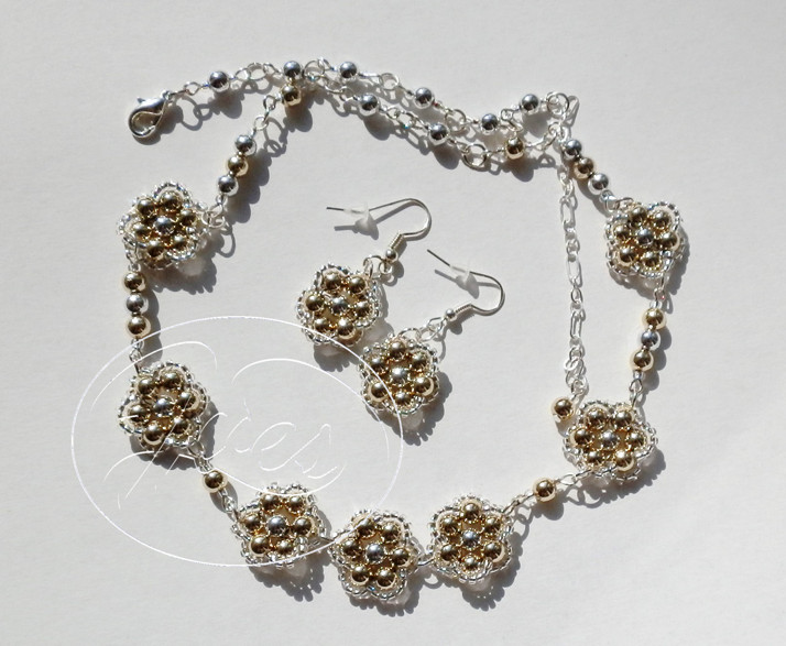 Kytičky šité drátkem ze zlatých a stříbrných korálků a čirého stříbrného rokajlu na ketlovaném závěsu.