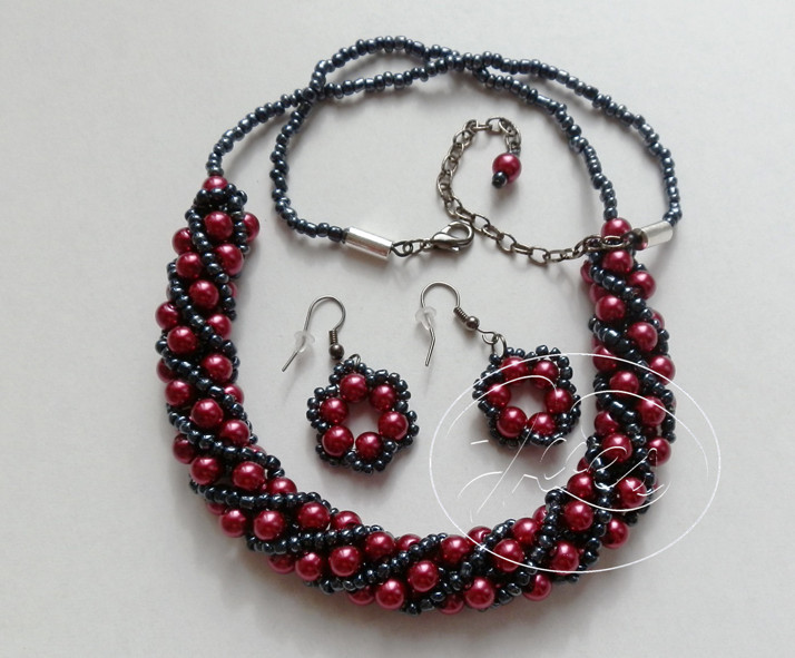 Spirála šitá z fuchsiových voskovek a hematitového rokajlu na závěsu