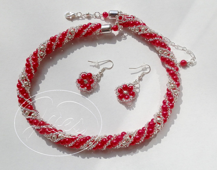 Spirála šitá ze stříbrných kuliček, malinově červených voskovek a čirého stříbrného rokajlu