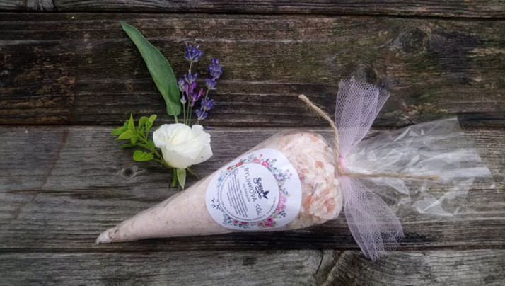 Himalájská sůl, bylinky a eterické oleje pro relaxační koupel.