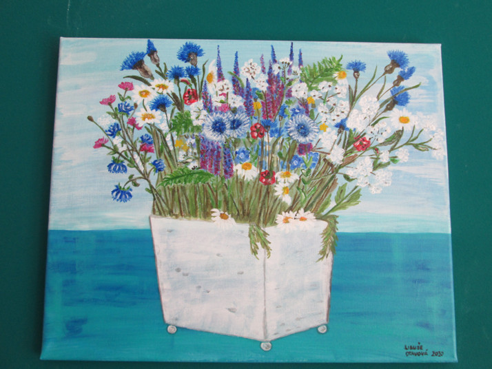 Květiny ve váze se skleněnýma nožičkama, akryl, 50x40 cm. Zafixován olejem. Cena 1350 Kč.