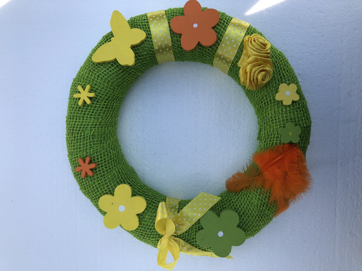 Základem je věnec slámový, který je potažen zelenou jutou, dále jsou použity stuhy, peříčka, dřevěné ručně vyřezávané kytičky.