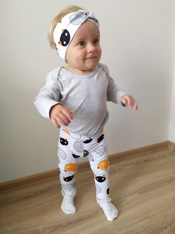 Čelenka a legíny pro milovníky koček tvoří stylový set. Jsou šity z elastického úpletu, který vašemu dítěti zajistí pohodlí.