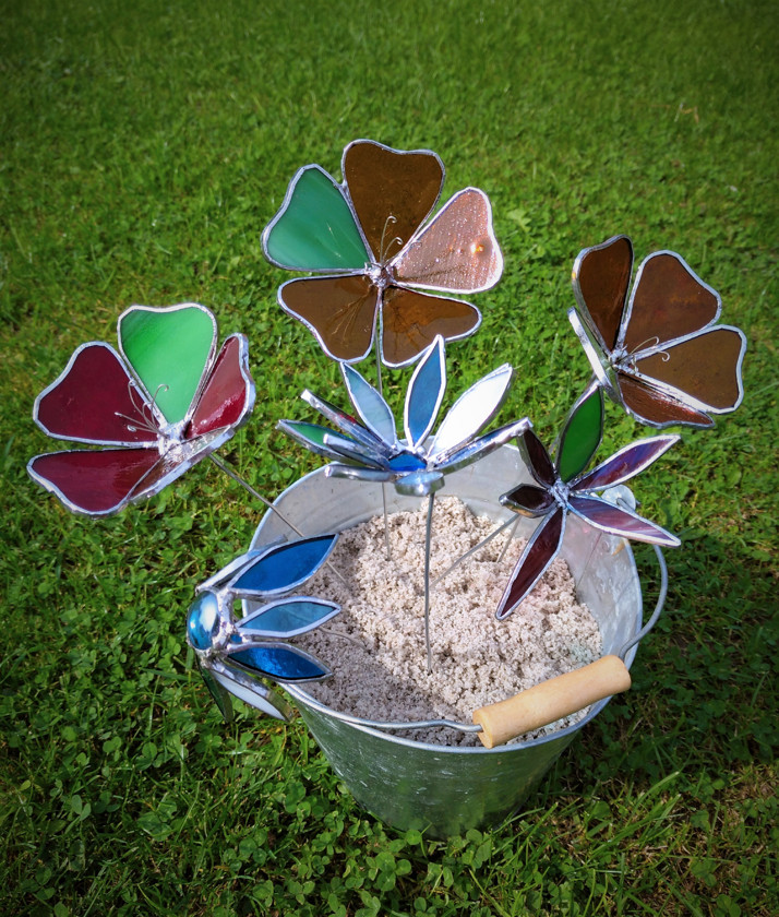 dekorativní květiny do květináče, truhlíku i na zahradu. Vyrobeno metodou Tiffany, povrchová úprava antioxidant.