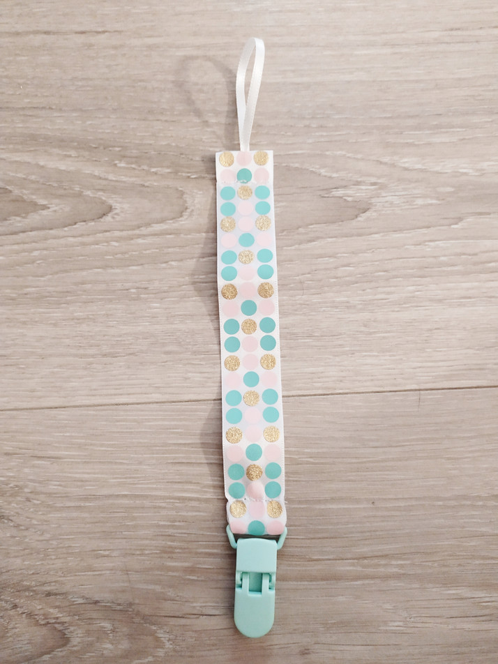 Klip na dudlík v jemných dětských barvách. Je použito plastové uzavírání, díky němuž je klip velmi lehoučký.