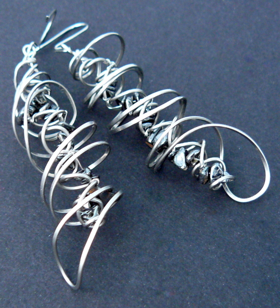 Rotrančené, ručně tepané náušnice z chirurgické oceli s hematitem. Vytvořeny se záměrem dopřát velké náušnice i těm, kdo nosí výrazné brýle.